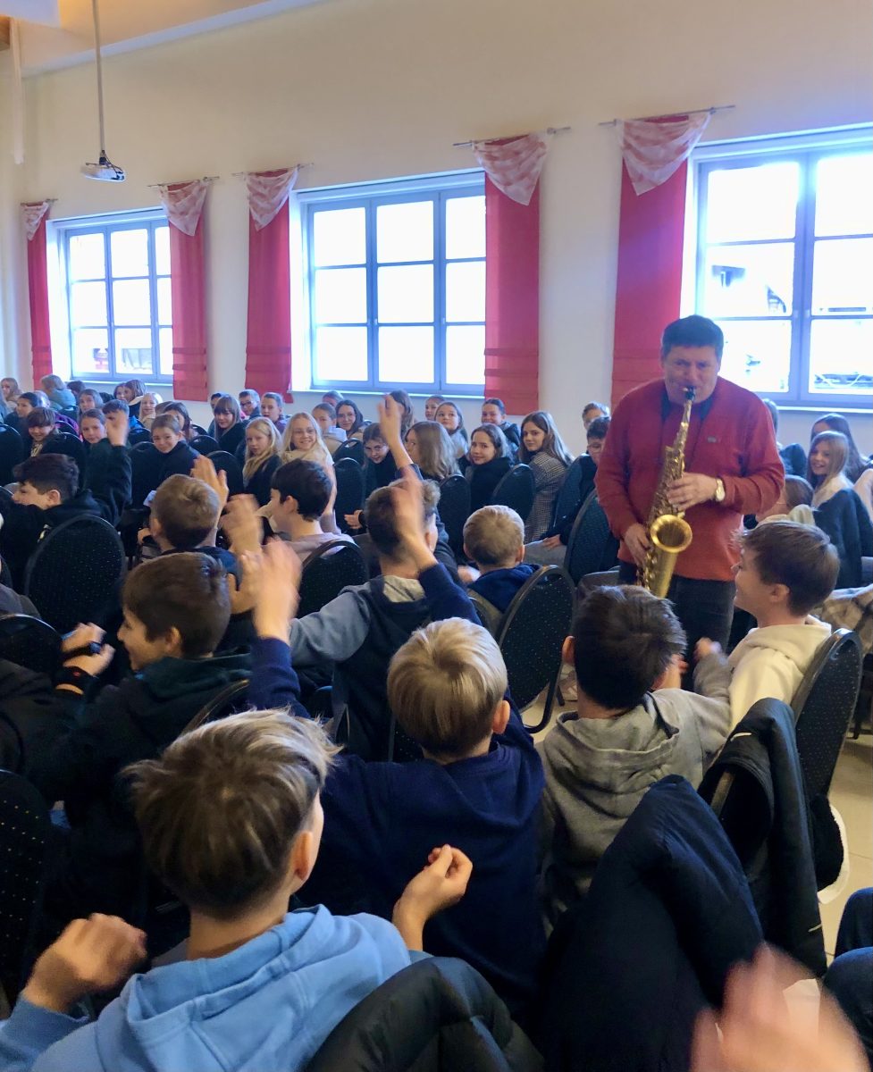 Die Klassen 5 und 6 begegneten den Fabeln ganz neu. Das Publikum wurde immer wieder aktiv einbezogen, durfte mitdenken, lachen und staunen – und so entstand eine Atmosphäre, die sowohl lehrreich als auch inspirierend war. Besonders beeindruckend waren das Doppel-Flöten-Spiel von Christian Georgi oder die eindrucksvollen Rezitationen des Duos. Für die Klassen 7 und 8 standen die großen Balladen im Mittelpunkt. Durch stimmungsvolle Musik wurde deutlich, warum diese Texte bis heute fesseln und berühren. Die Klassen 9 und 10 tauchten schließlich in die poetische