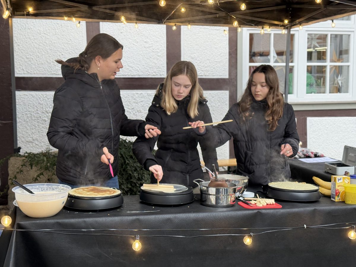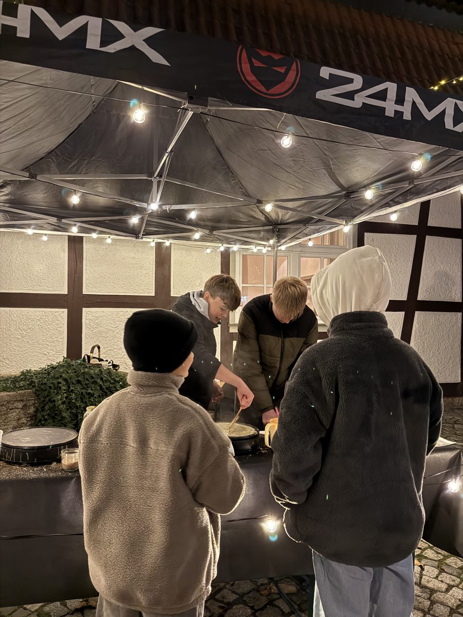 Am 1. Advent war die Klasse 8b des Käthe-Kollwitz-Gymnasiums mit einem eigenen Stand auf dem Lengenfelder Weihnachtsmarkt vertreten. Mit viel Engagement, guter Laune und weihnachtlicher Dekoration boten die Schülerinnen und Schüler dort eine Auswahl an selbstgemachten Leckereien an. Besonders beliebt waren die frisch zubereiteten Crêpes sowie bunte Bruchschokolade, die liebevoll verpackt und präsentiert wurden.