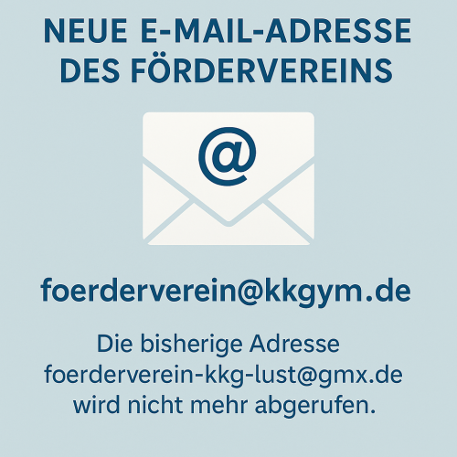 Bitte beachten Sie, dass die bisherige E-Mail-Adresse foerderverein-kkg-lust@gmx.de nicht mehr abgerufen wird. Wir bitten daher darum, ausschließlich die neue E‑Mail‑Adresse zu verwenden.