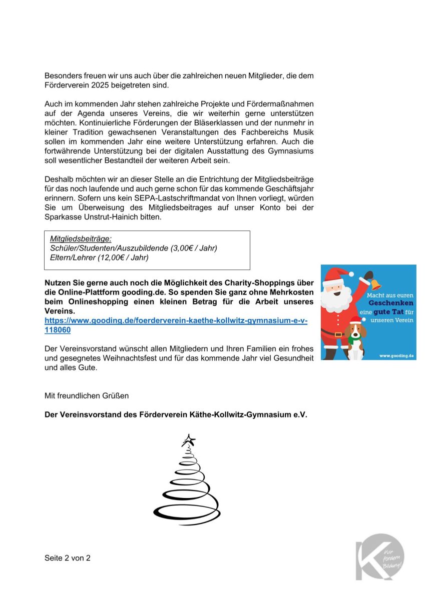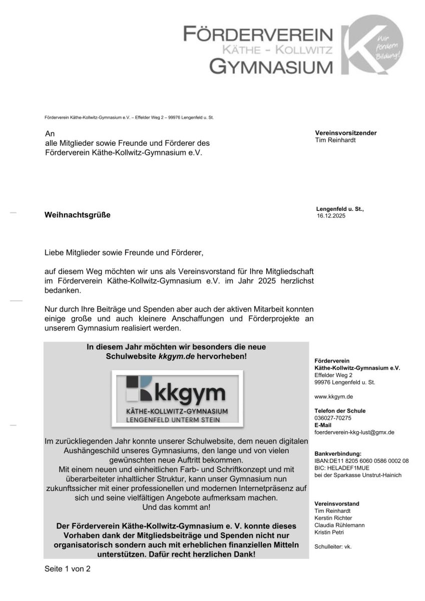 Der Förderverein Käthe-Kollwitz-Gymnasium e.V. bedankt sich bei allen Mitgliedern, Freunden und Förderern für die wertvolle Unterstützung im Jahr 2025.