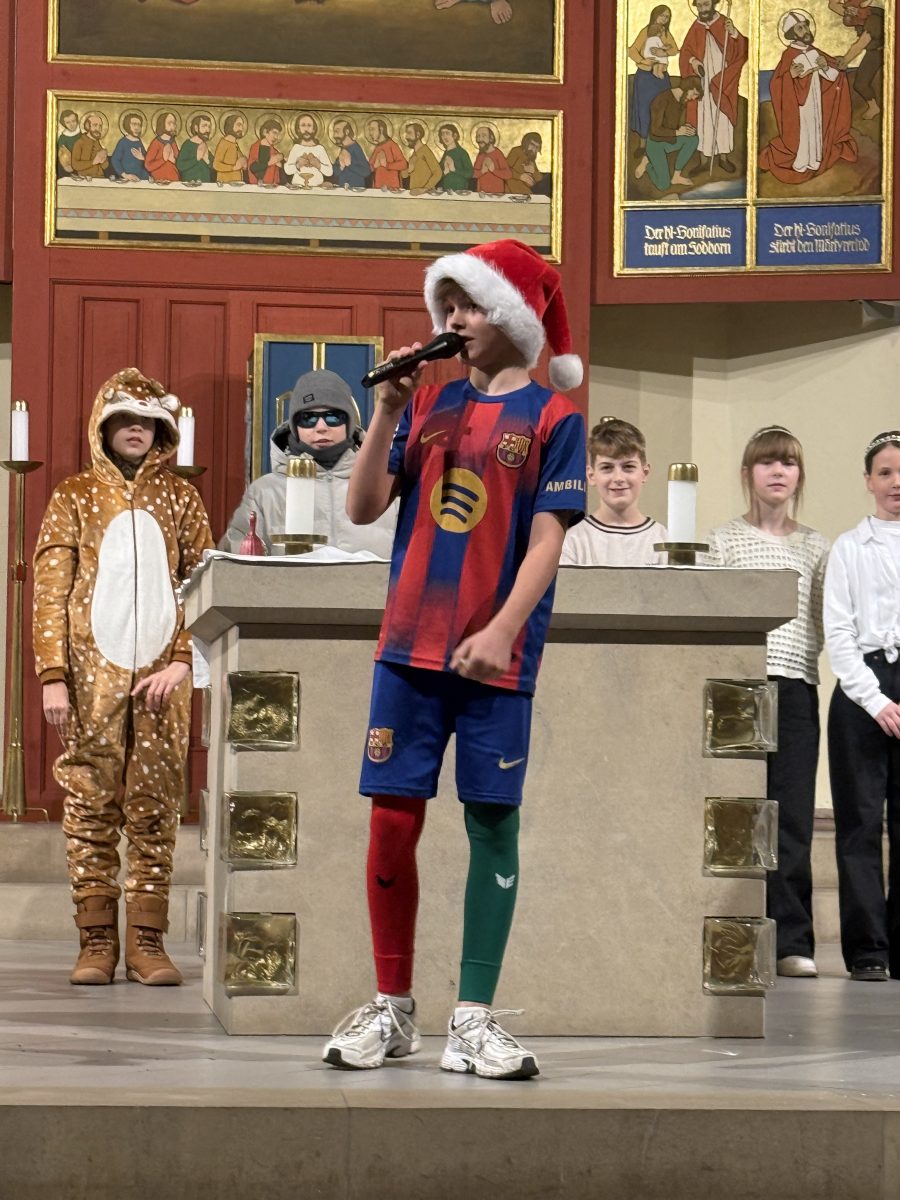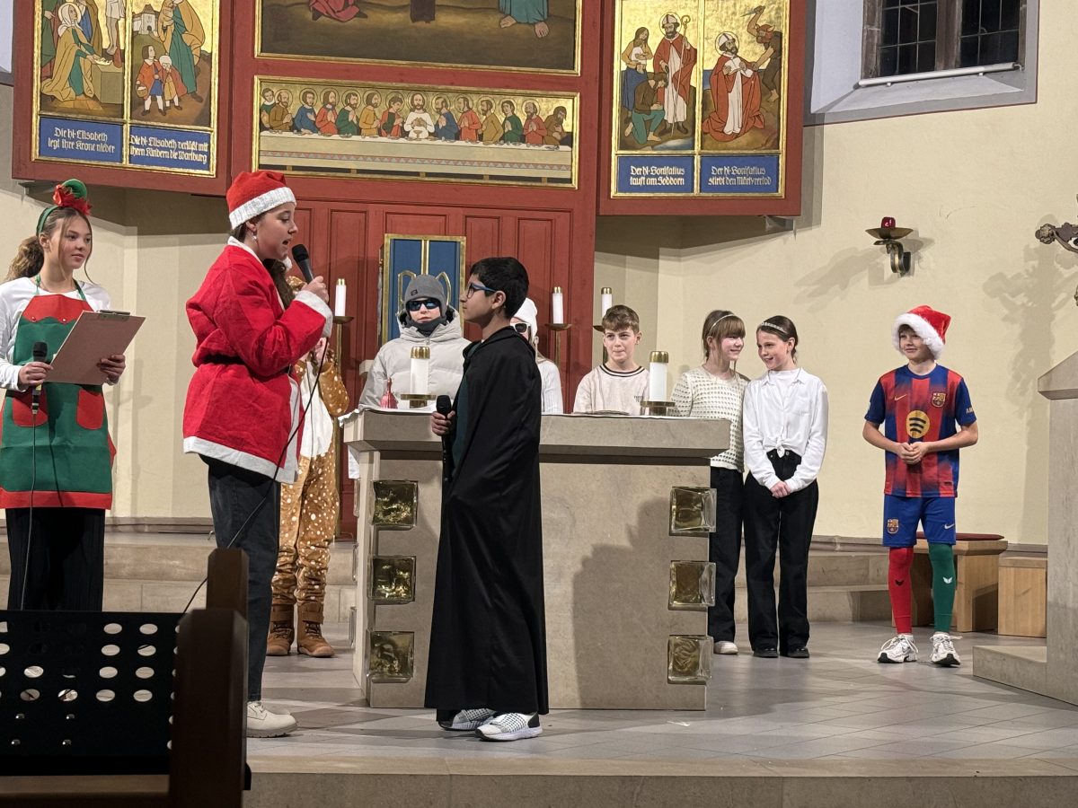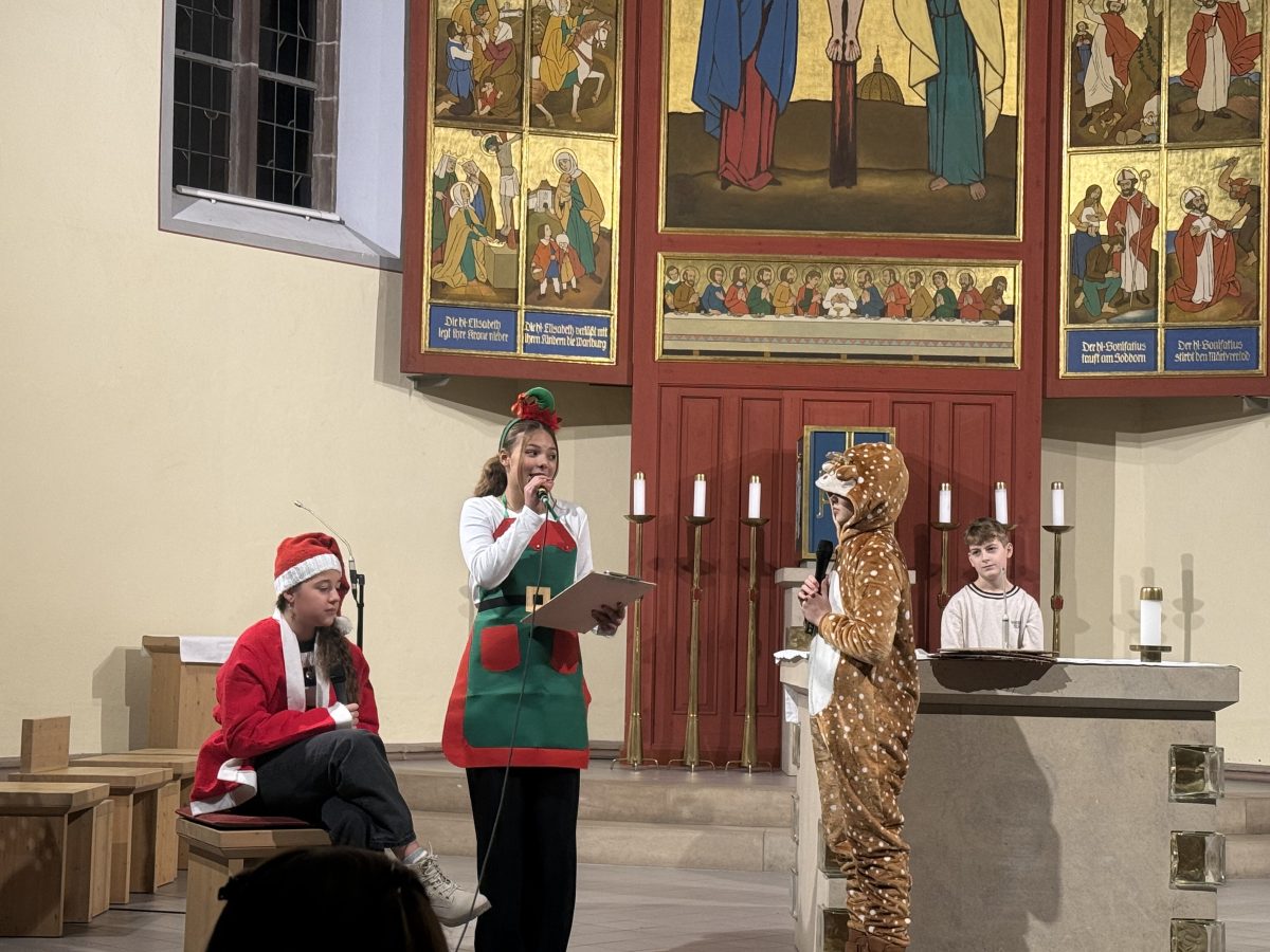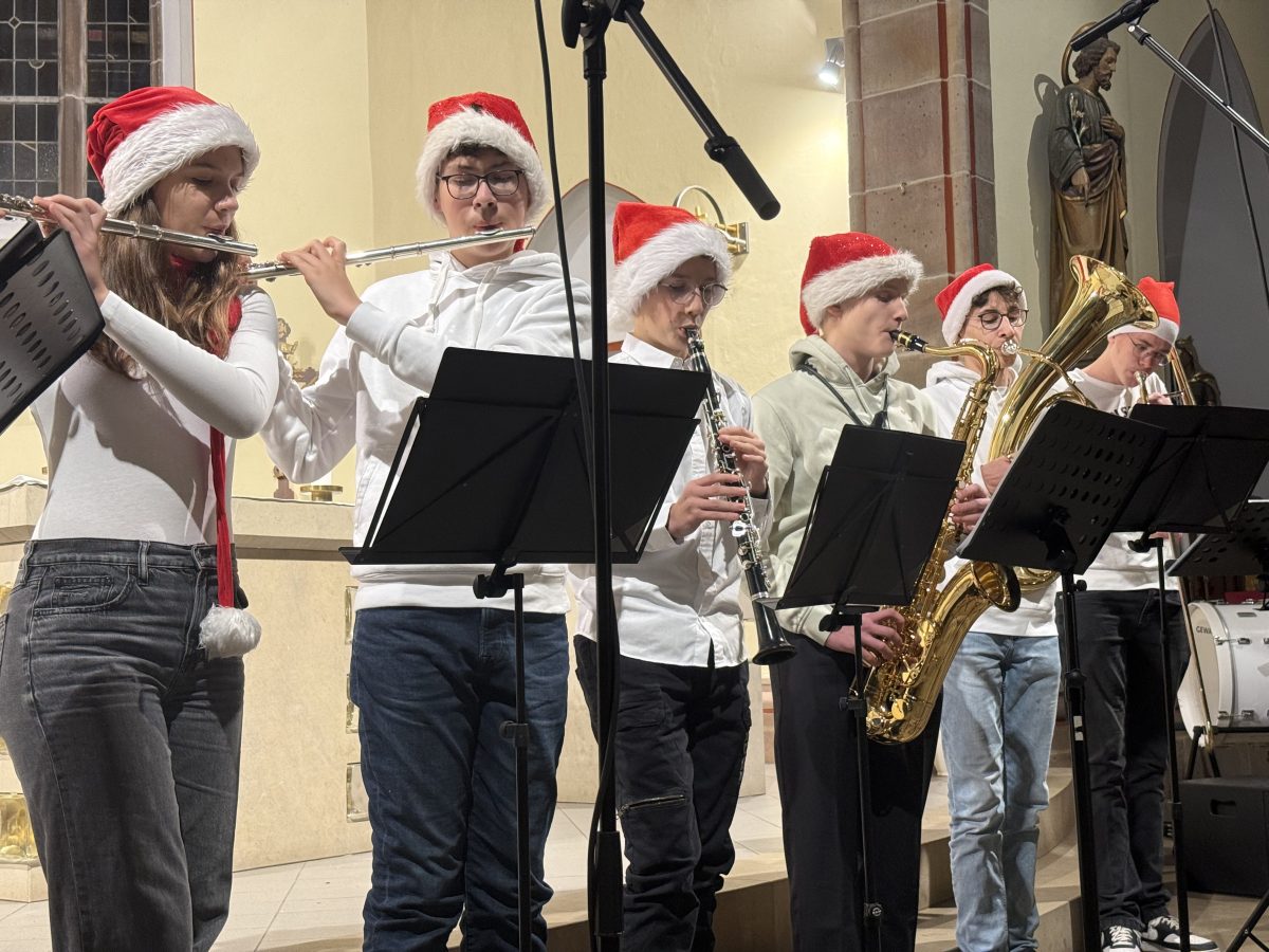Die Bläserklasse 6b eröffnete den Abend mit klassischen Weihnachtsliedern, gefolgt von den fünften Klassen mit besinnlichen Chorstücken. Die Grundschüler begeisterten mit einem fröhlichen Tanz zu „All I Want for Christmas“. Schülerinnen aus der 6b sorgte zudem mit „Hijo de la Luna“ und „Last Christmas“ für ein musikalisches Highlight.